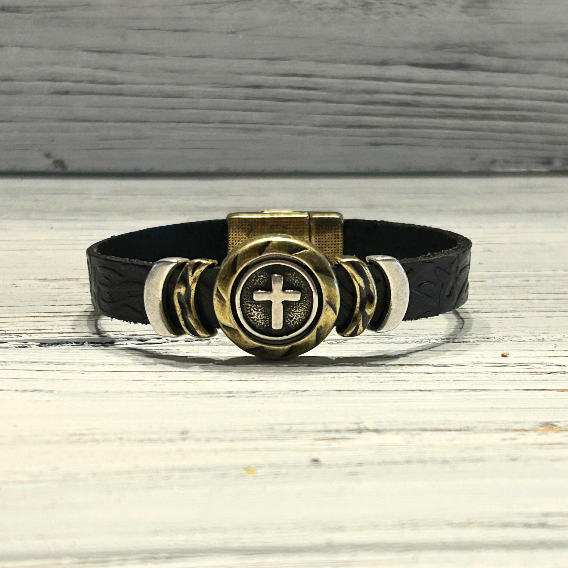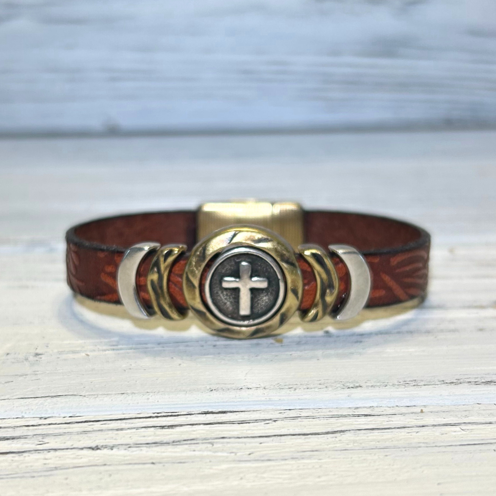 This bracelet is another unique version of our very popular cross collection.  This piece features the fun embossed leathers and incorporates both silver and brass metals.