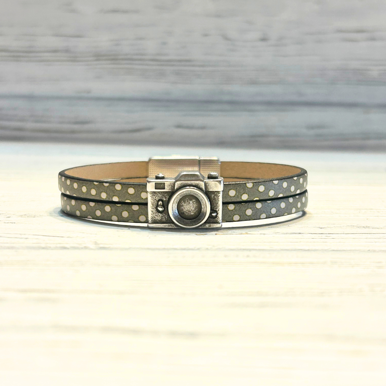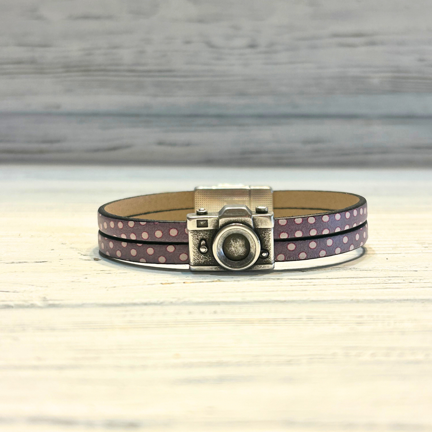 These lovely piece is perfect for the photographer. A candid camera to show off on their wrist! They're pictured here in the new green and purple polka dot leather.